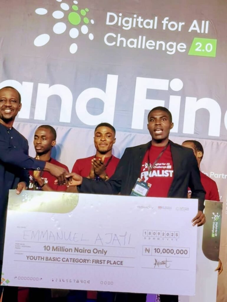In a remarkable display of brilliance, innovation, and academic excellence, Emmanuel Aanu Ajayi, a 500-level student of Electrical and Computer Engineering at Kwara State University (KWASU), Malete, also serving as the Academic Coordinator of CAC Mount of Blessing, Kwara State University, has emerged as the First Place Winner at the National Finals of the Digital For All Challenge 2.0.