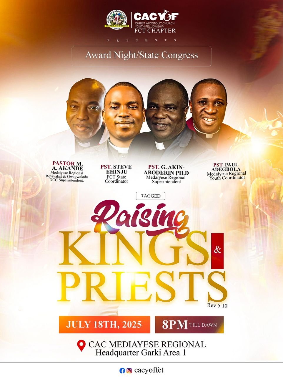 Christ Apostolic Church Youth Fellowship (CACYOF), FCT Chapter, will by 8pm today, July 18, 2025, hold her much-anticipated 2025 Award Night and State Congress, at the CAC Medaiyese Regional Headquarters, Garki Area 1, Abuja.